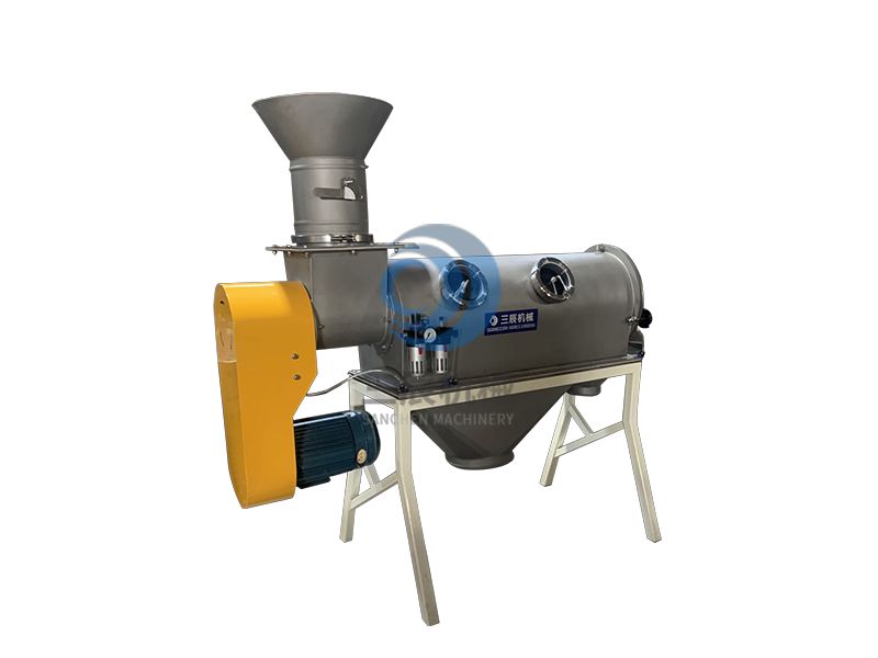 篩機(jī)由電機(jī)、機(jī)座、篩箱、進(jìn)出料推進(jìn)裝置等組成。物料由料斗經(jīng)螺旋輸送進(jìn)入篩箱,分流葉片連續(xù)轉(zhuǎn)動(dòng),形成了物料在篩箱內(nèi)不斷的更新推進(jìn),使物料產(chǎn)生運(yùn)動(dòng)沖向篩網(wǎng),細(xì)料通過篩網(wǎng)落入成品倉,粗料繼續(xù)向前推進(jìn),在粗料口排出,從而達(dá)到理想的篩分效果。